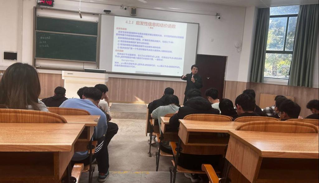 本次观摩的课程聚焦“人工智能在机器人中的应用”,秦建华教授凭借深厚的学术功底和丰富的教学经验,打造了一堂理论与实践深度融合的优质课程。课堂上,他以家用扫地机器人导航原理为切入点,逐步引入优化算法、路径规划等核心知识点,通过动画演示、代码片段解析等方式,将抽象的理论概念具象化。互动环节中,秦教授精准回应学生疑问,引导学生结合机器人工程专业特色思考问题,课堂氛围活跃有序。